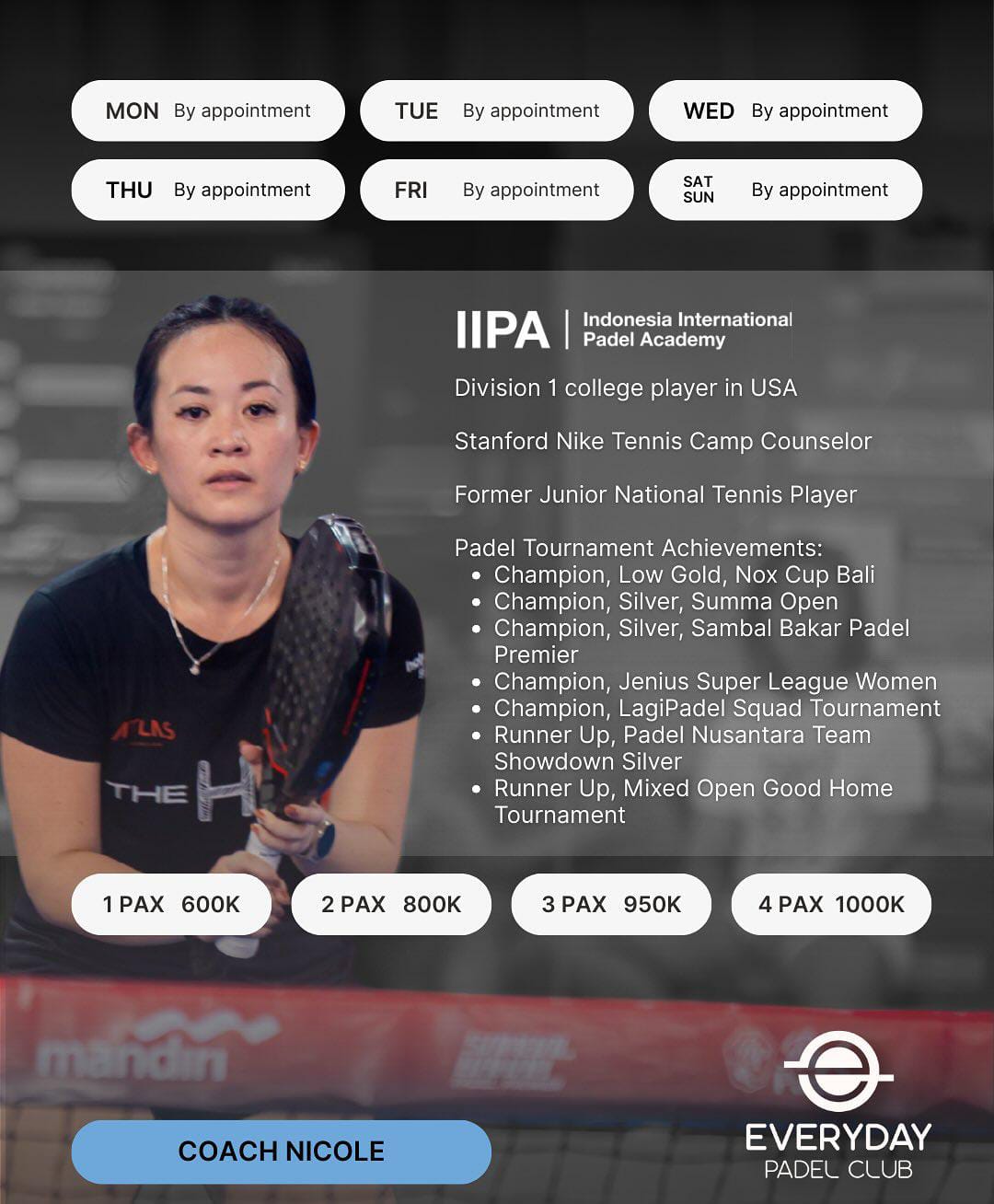 Untuk padel, jadwalnya bahkan lebih padat: coaching di pagi hari dan latihan malam sebanyak enam kali seminggu, dengan akhir pekan yang sering diisi tournament.