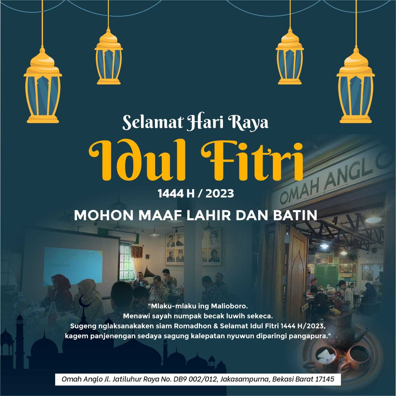 Kami sebagai dari bagian kecil kehidupan anda, para penikmat dan tamu-tamu baru mungkin yang hadir dan pernah mencicipi semua hidangan dan “ nuansa Yogyakarta” di Omah Anglo untuk Ramadhan 1444 H ini juga sama, ijinkan untuk minta maaf lahir dan batin, jika selama ini ada dalam semua pelayanannya kurang berkenan mungkin,baik di citarasa, pelayanan, dan semua yang ada di tempat ini.