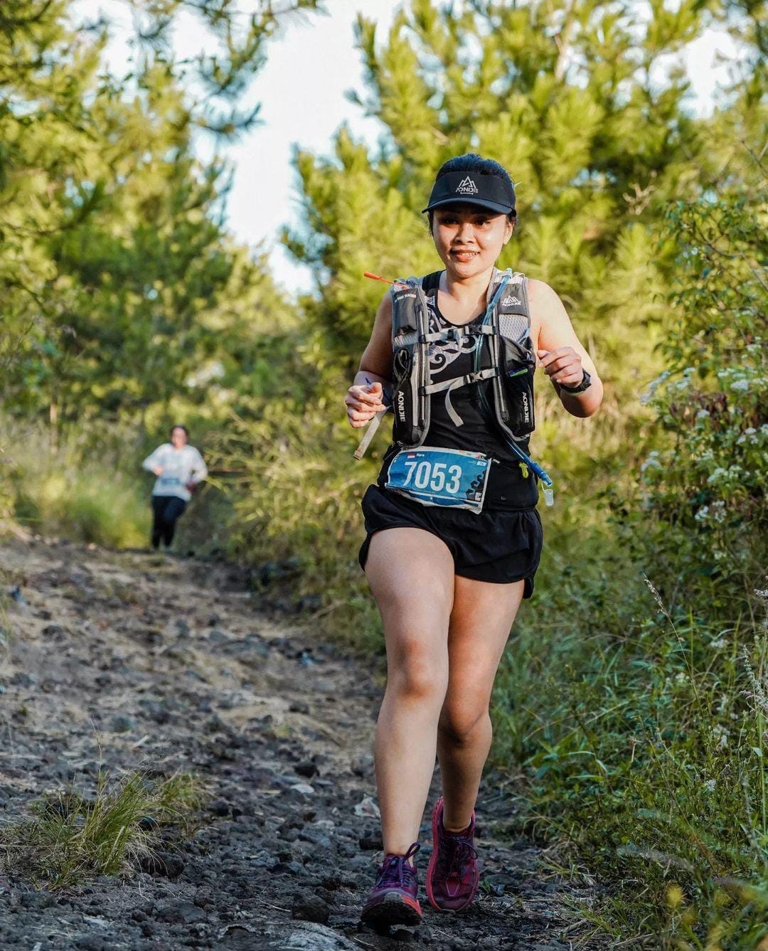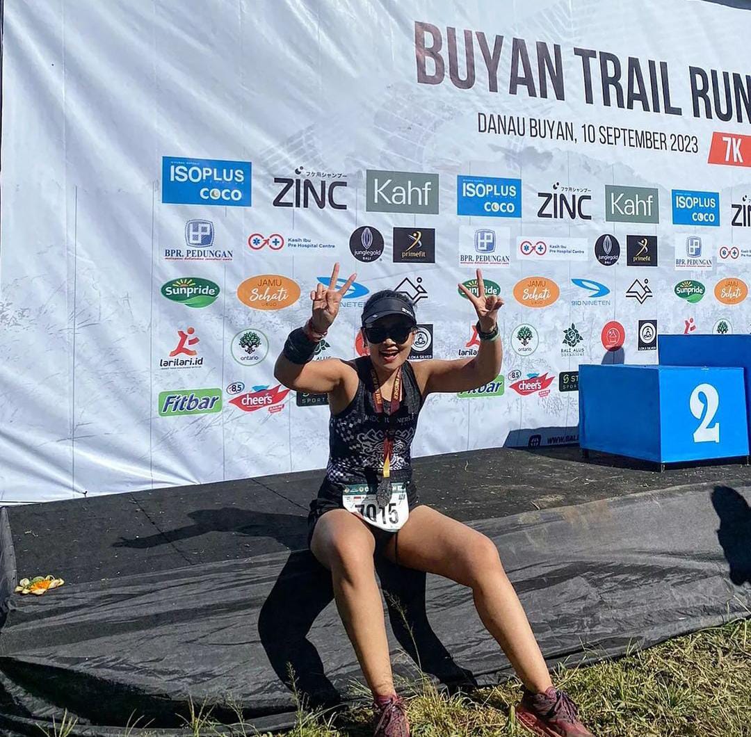 Ia menceritakan hobinya kepada kami. “Awalnya suka mendaki, lalu mendaki kan juga butuh kesiapan fisik, latihannya ya jogging, lalu tertarik trail run karena enak liatnya bisa lari-lari di gunung dengan bawaan sedikit. Lalu baru terakhir tertarik ke road run. Sekarang trail run dan road run sama-sama jalan. Cross trainingnya gym dan yoga, dan jumping rope buat penguatan kaki. Udah itu aja.”